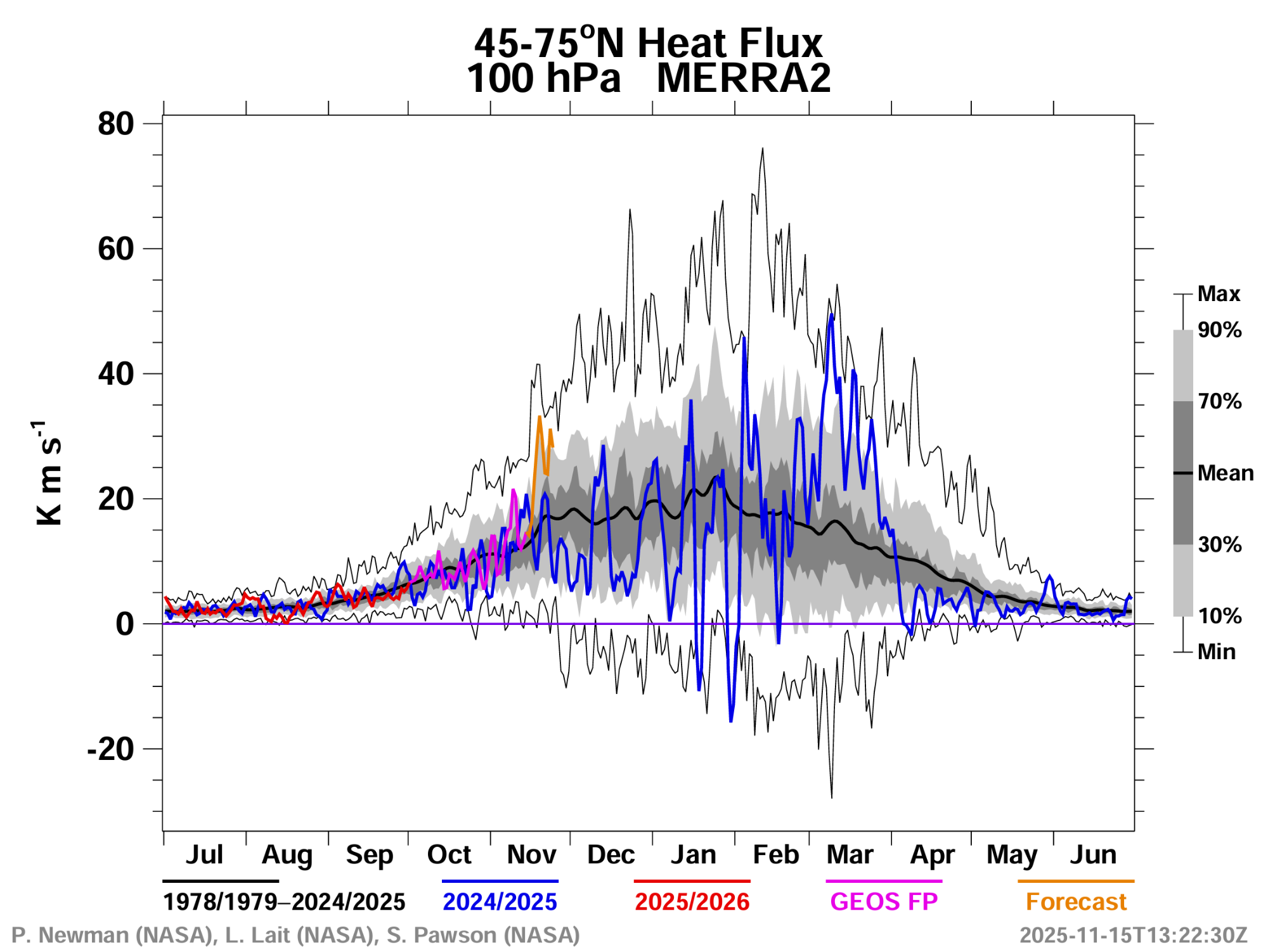 Obr. 5 Vývoj toku tepla mezi 45–75° severní z. š. v letošní sezóně (červeně a růžově)