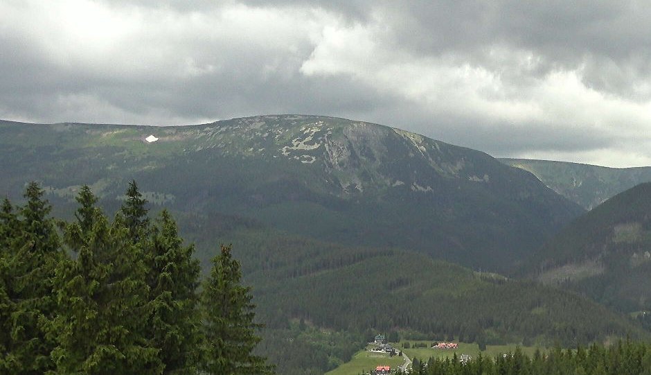 Sněhové pole na Studniční hoře dnes odpoledne, pohled z vrcholu Javor poblíž obec Pec pod Sněžkou