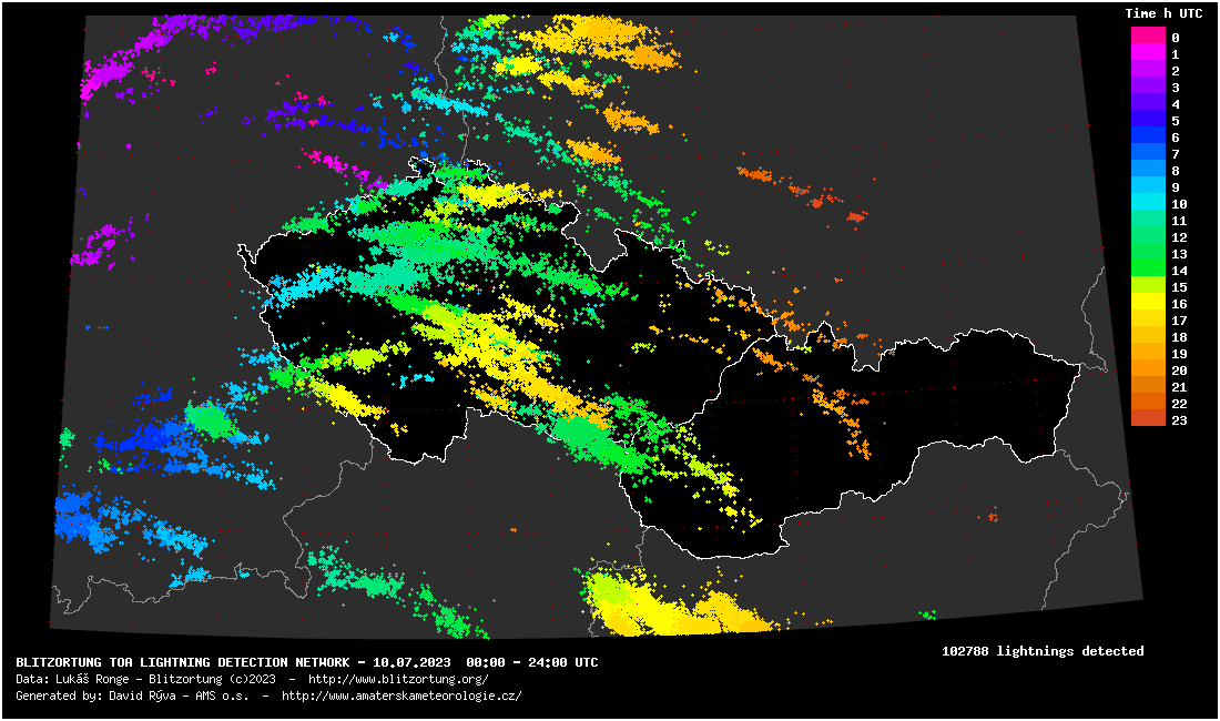 Mapa blesků za včerejší den, barevně odlišeny dle času