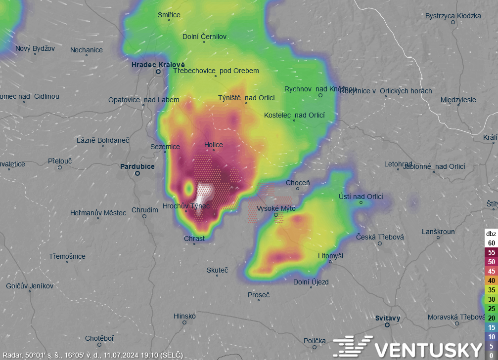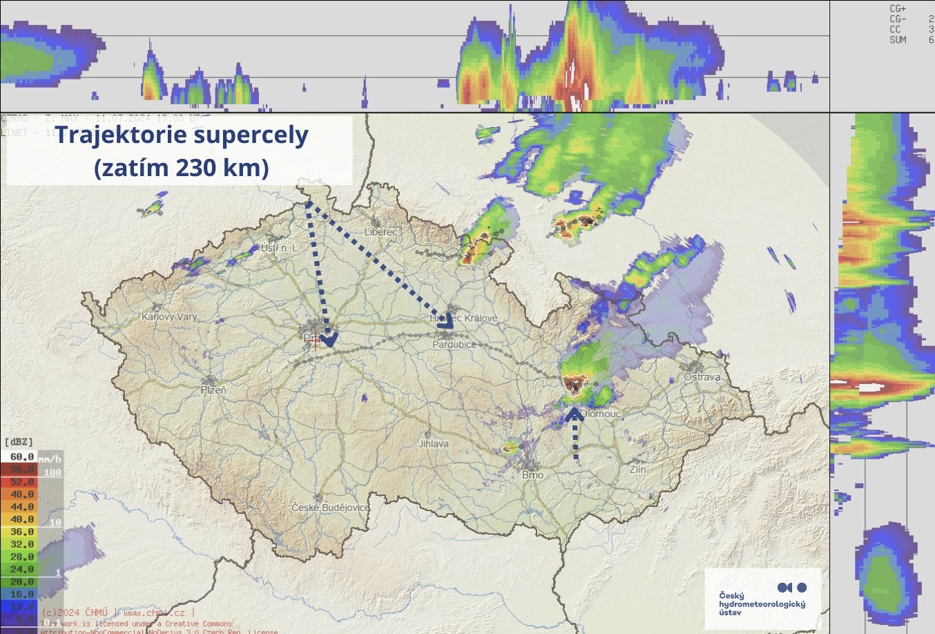 Dráha supercely, která v Pardubickém kraji na řadě míst produkovala kroupy kolem 3-4 cm