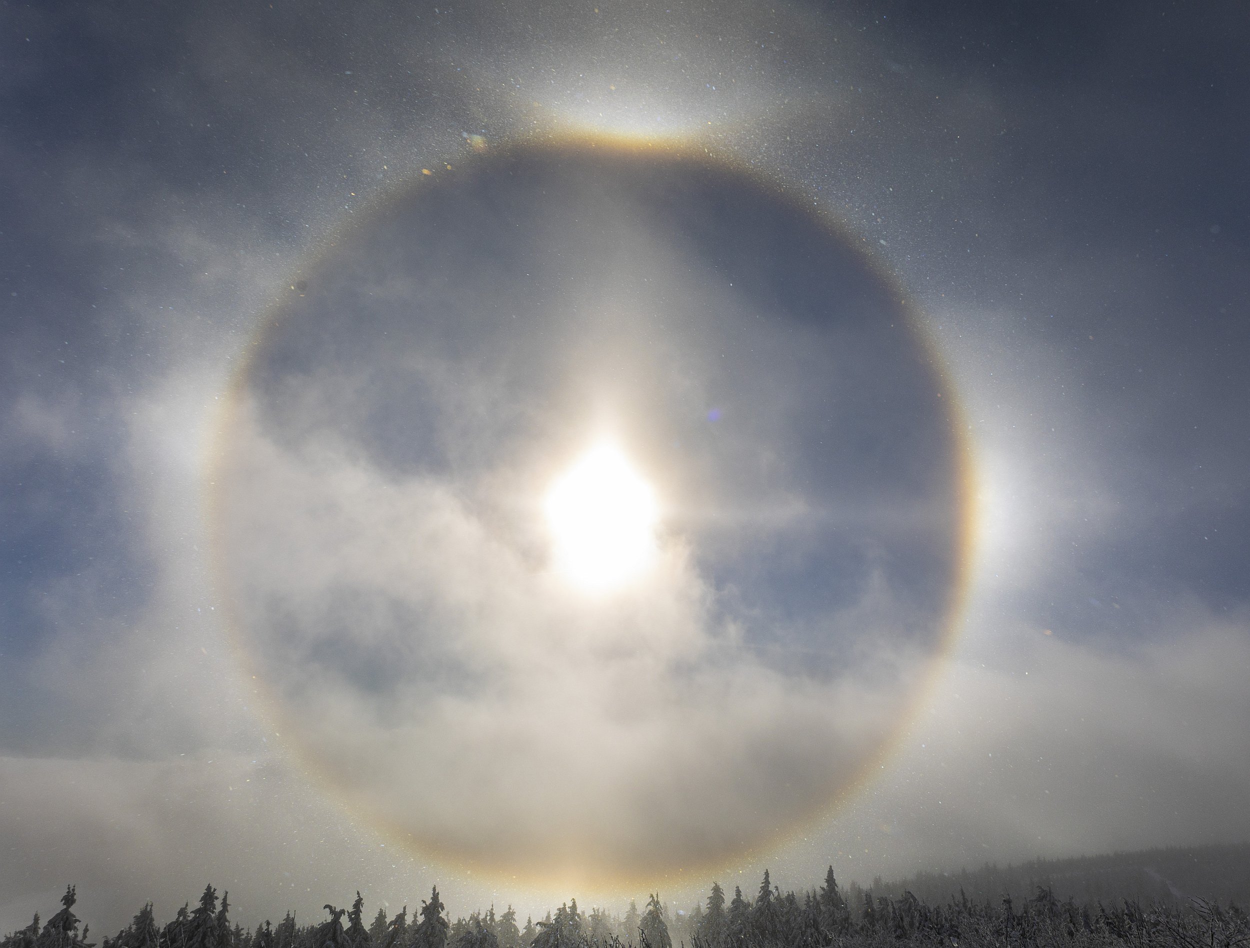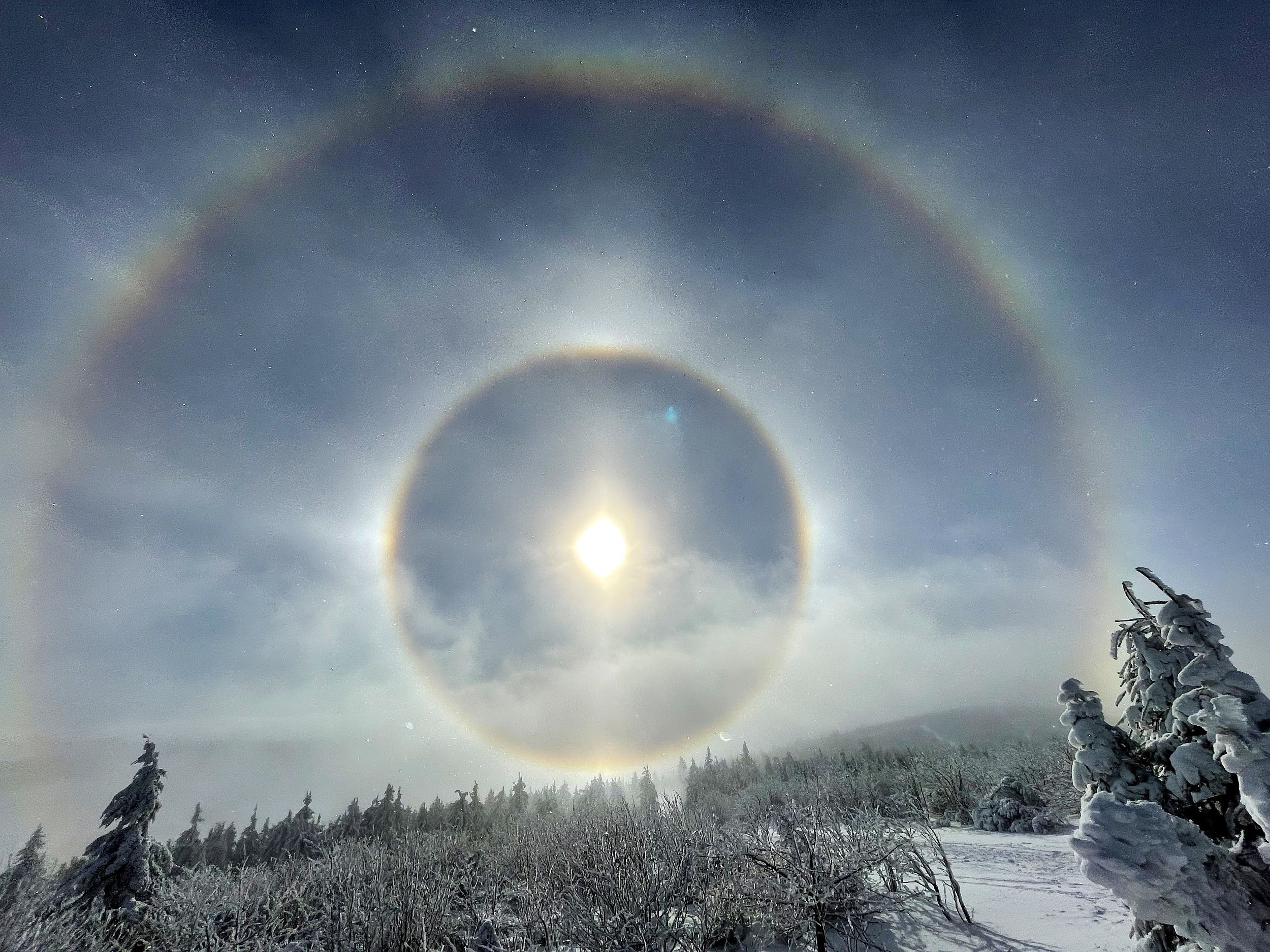 V Krušných horách leží i přes 30 cm sněhu, na vrcholcích se tvořily krásné halové jevy