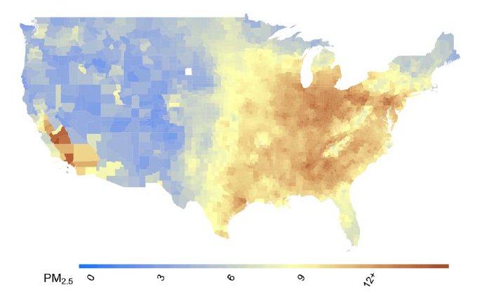 Mapa ukazuje dlouhodobé (2000-2016) úrovně znečištění ovzduší v USA prachovými částicemi PM2.5 - právě tento průměr vědci srovnali s počtem obětí v jednotlivých regionech USA