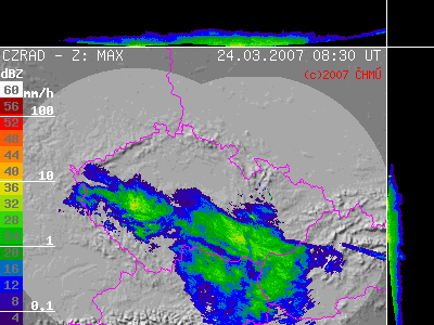 Radarový snímek ve 23:00 Zdroj: ČHMÚ
