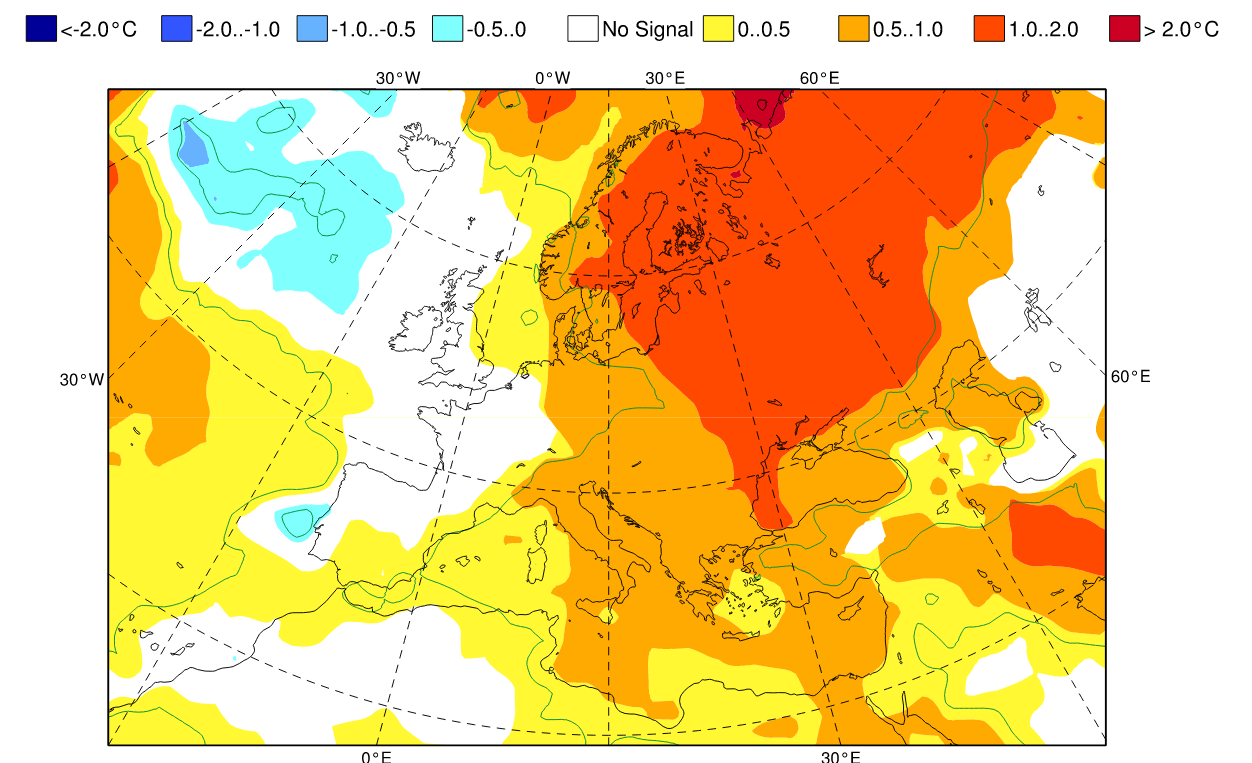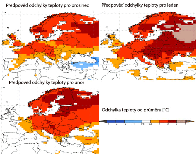 Očekávaná odchylka teploty vzduchu v Evropě za zimu 2020/2021 podle modelu ECMWF