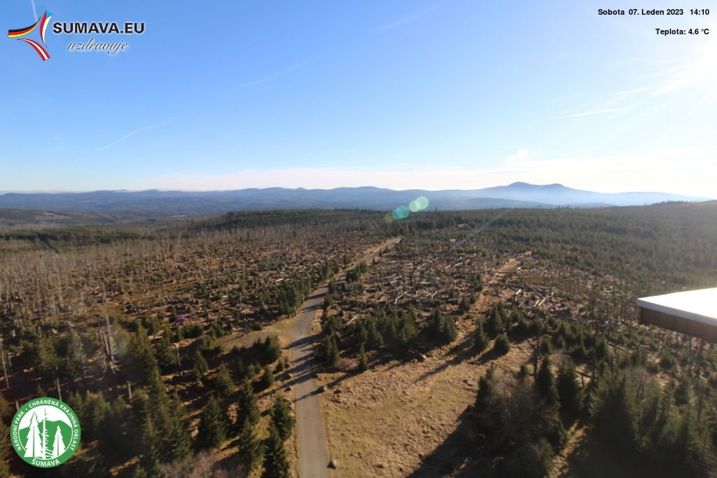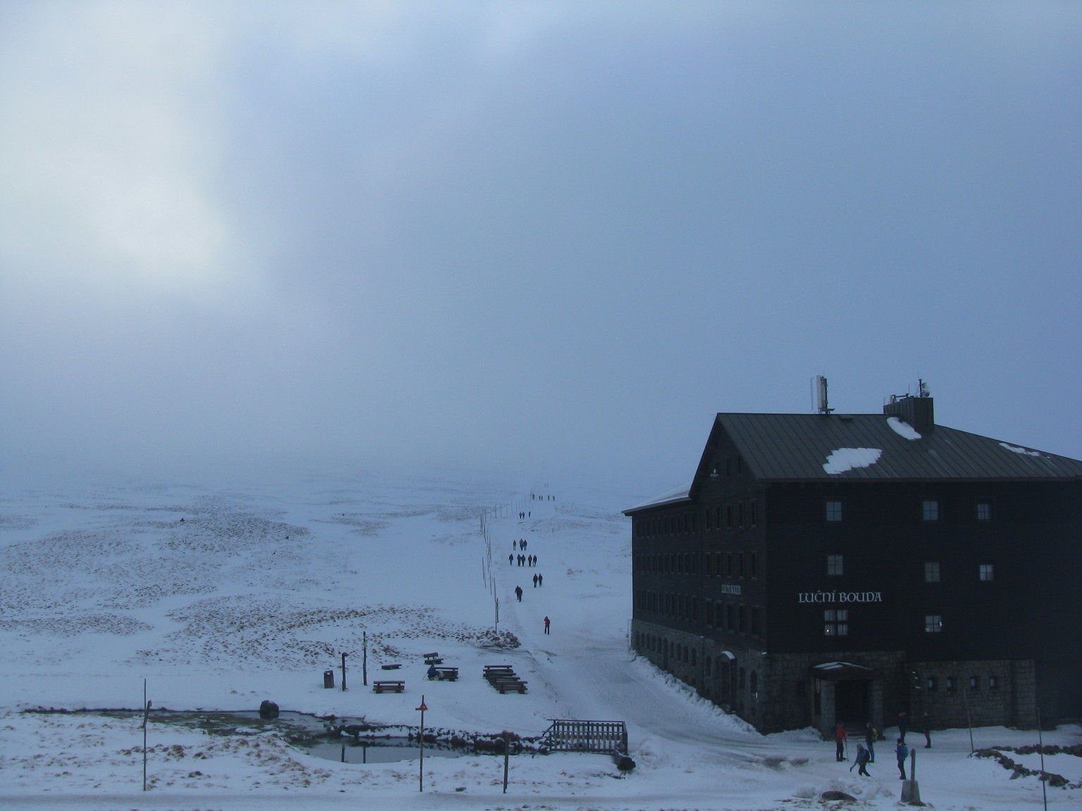 Luční bouda na hřebenech Krkonoš dnes odpoledne - i v těchto nejvyšších polohách u nás ze sněhu vylézají traviny