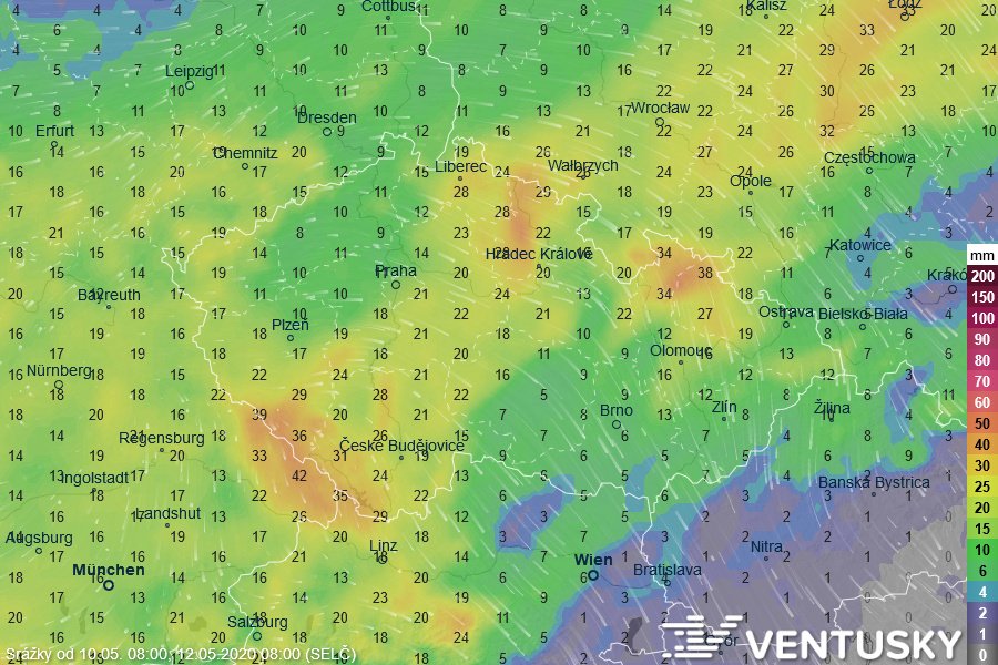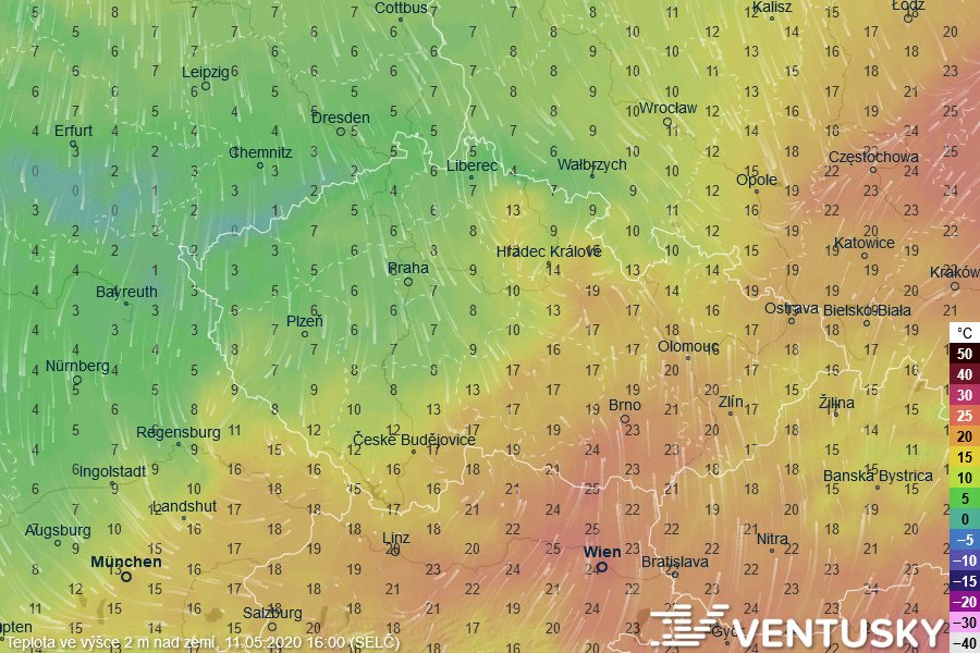 Teploty zítra v 16:00 - zatímco na jihu Moravy bude ještě letních 25 °C, na Chebsku bude jen kolem 3 °C - teplotní rozdíl bude přes 20 °C