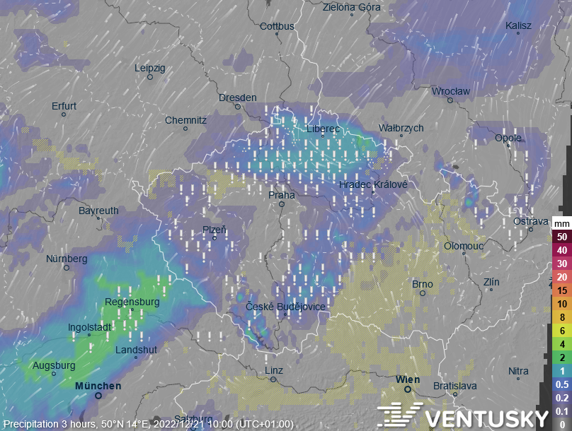 Očekávané srážky zítra odpoledne - ledovka se bude tvořit hlavně na Moravě (ledovka je označena vykřičníky)