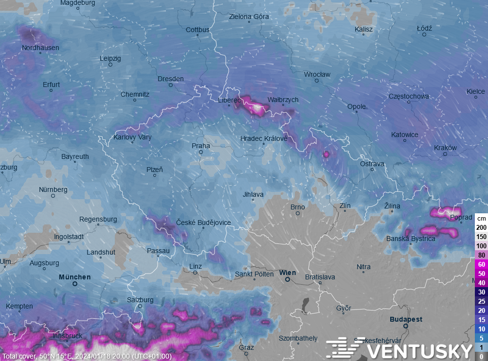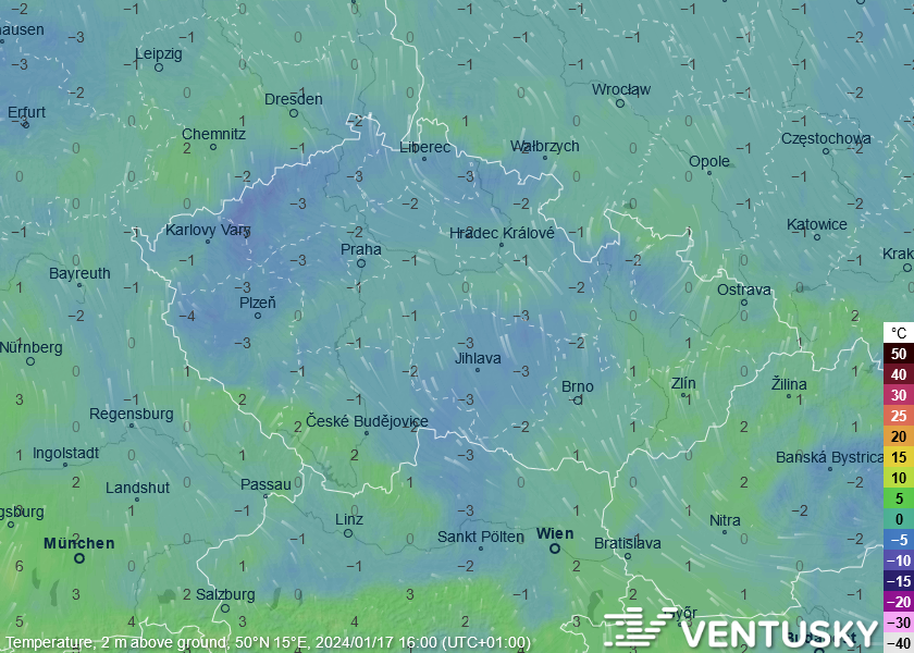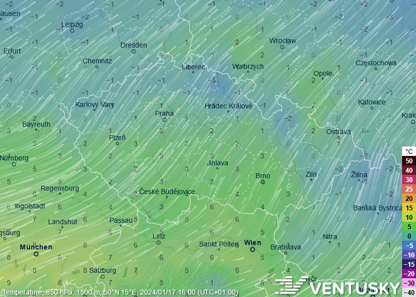Teplota ve výšce 1500 m nad zemí dnes v 16:00 - ve výšce ale kromě severu mrznout nebude a díky tomu se bude vyskytovat mrznoucí déšť