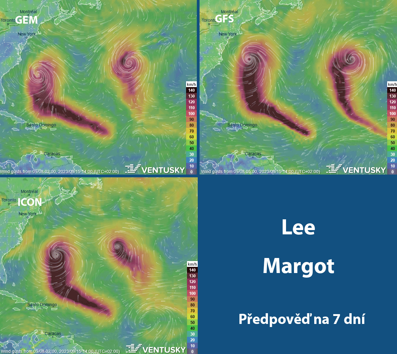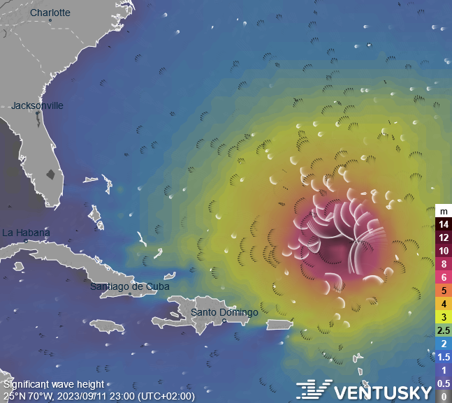 Ačkoliv Lee bude postupovat daleko od obydlených území, vysoké vlny, které bude vytvářet, zasáhnou především severní pobřeží Malých i Velkých Antil a Baham (na obrázku očekávaná výška vln v pondělí příští týden)
