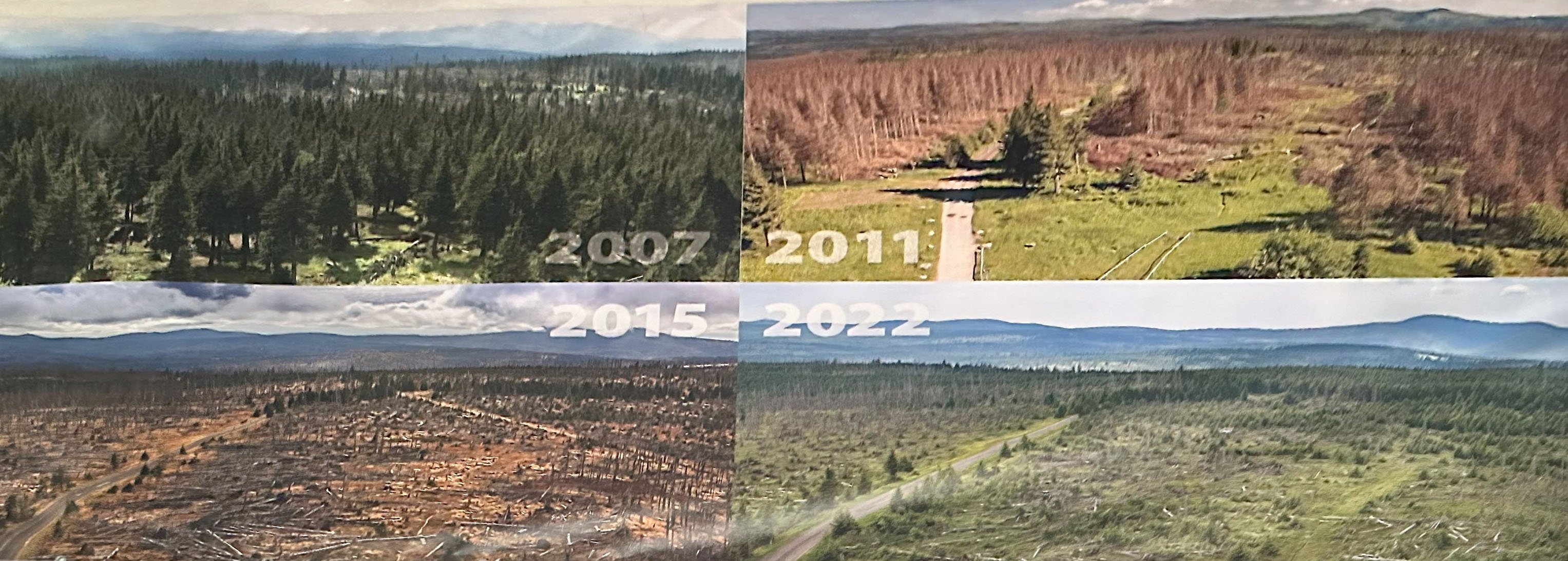Vývoj lesa na Poledníku - první obrázek v roce 2007, poslední z roku 2022