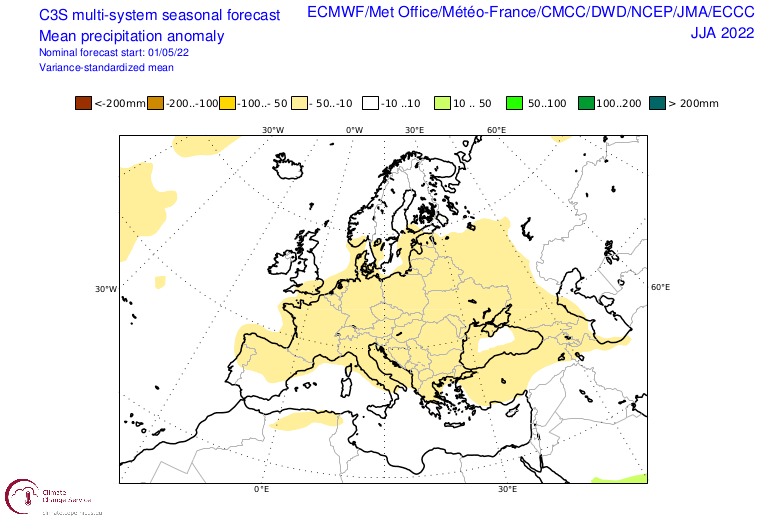 Předpověď odchylky srážek pro celé léto – multimodelový průměr ze začátku května