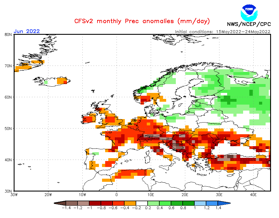 Očekávaná odchylka srážek za červen podle předpovědi CFS