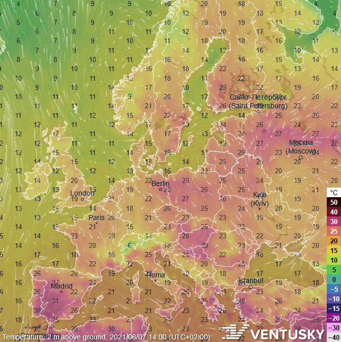 Očekávané teploty v pondělí odpoledne v Evropě - střední Evropa bude patřit k nejteplejším oblastem v Evropě, výrazně tepleji bude jen ve Španělsku