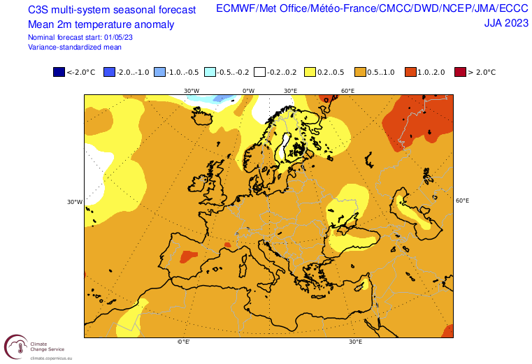 Očekáváná odchylka teploty vzduchu za celé léto podle multimodelového výpočtu - v Evropě se čeká teplotně nadprůměrné léto