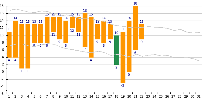 Dosavadní teploty v říjnu v Praze - Libuši - šedou čárou je znázorněn dlouhodobý průměr