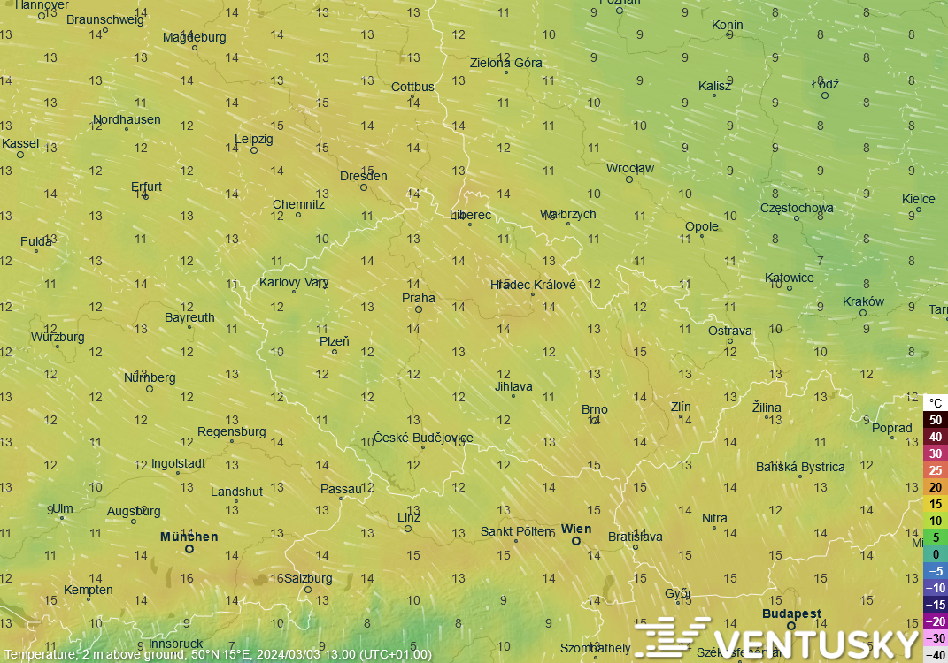 Očekávané teploty v úterý odpoledne - na východě bude výrazně tepleji než na západě