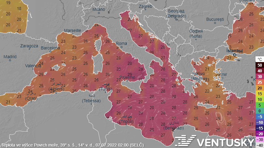 V centrálním Středomoří se moře prohřálo téměř na 30 °C, jde o nadprůměrné hodnoty