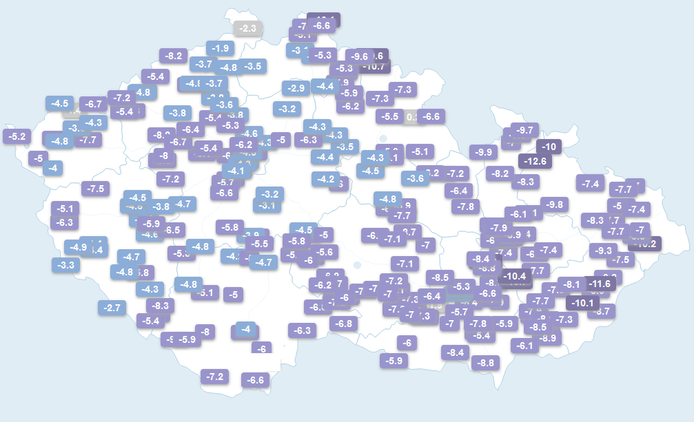 Teploty dnes v 6:30 - na Moravě bylo i kolem -10 °C