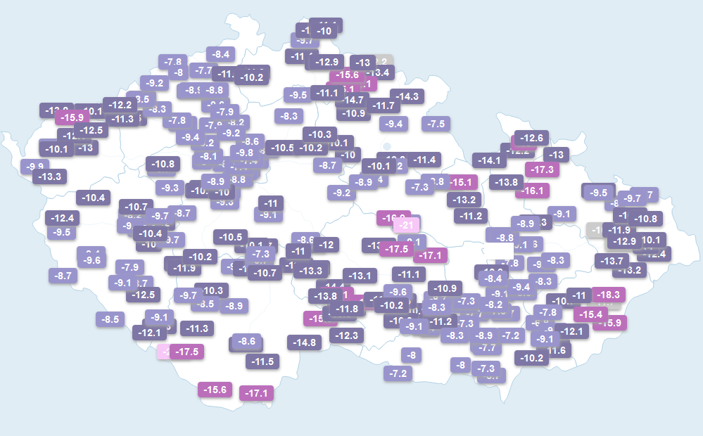 Teploty dnes ráno v 7:30 na stanicích v Česku