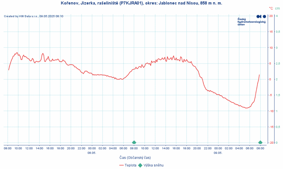 Dnes ráno teploty v průměru klesly ještě o něco níže než ve středu ráno a šlo tak o nejchladnější ráno od začátku dubna. V mrazových kotlinách na horách teploty klesly téměř k -10 °C. Nejchladněji bylo na Jizerce rašeliništi v Jizerských horách, kde podle ČHMÚ naměřili -9,7 °C (na stanici je o květnový rekord v minimální teplotě, ale měří jen 12 let). Absolutně nejnižší květnová teplota na našem území byla naměřena na sousední stanici na Jizerce 4. května v roce 2011, kdy tu bylo -13,1 °C (dnes na této stanice bylo -8,3 °C). Současné teploty jsou výrazně podprůměrné a na květen nejnižší za několik posledních let.