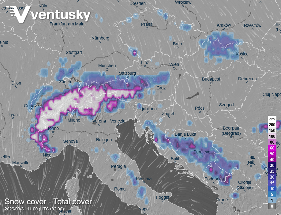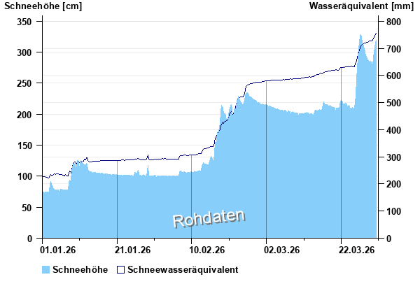 Vývoj sněhové pokrývky na Zugspitze od začátku roku - zatímco v lednu a únoru byla podprůměrná, nyní je nadprůměrná