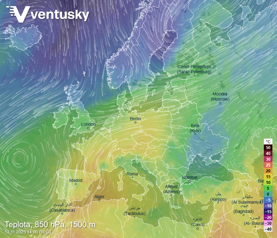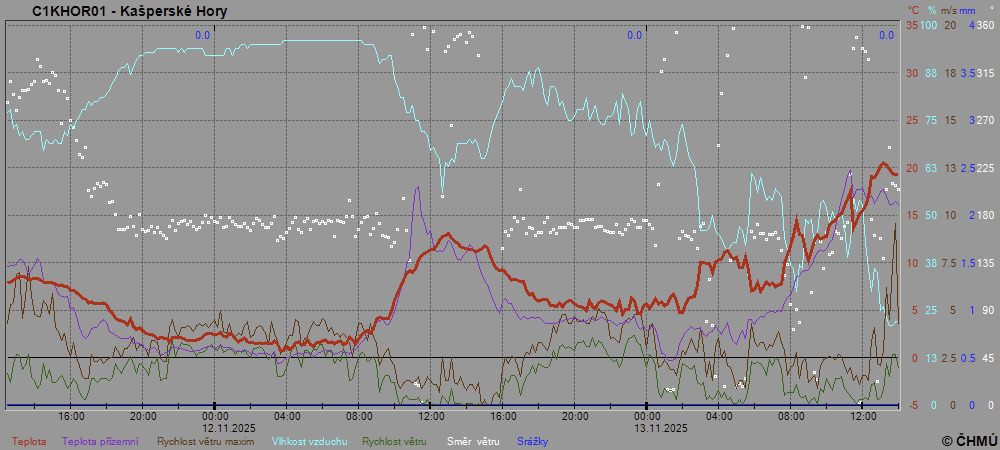 Vývoj teploty (červenou čarou) na stanici Kašparské Hory za psolední dva dny