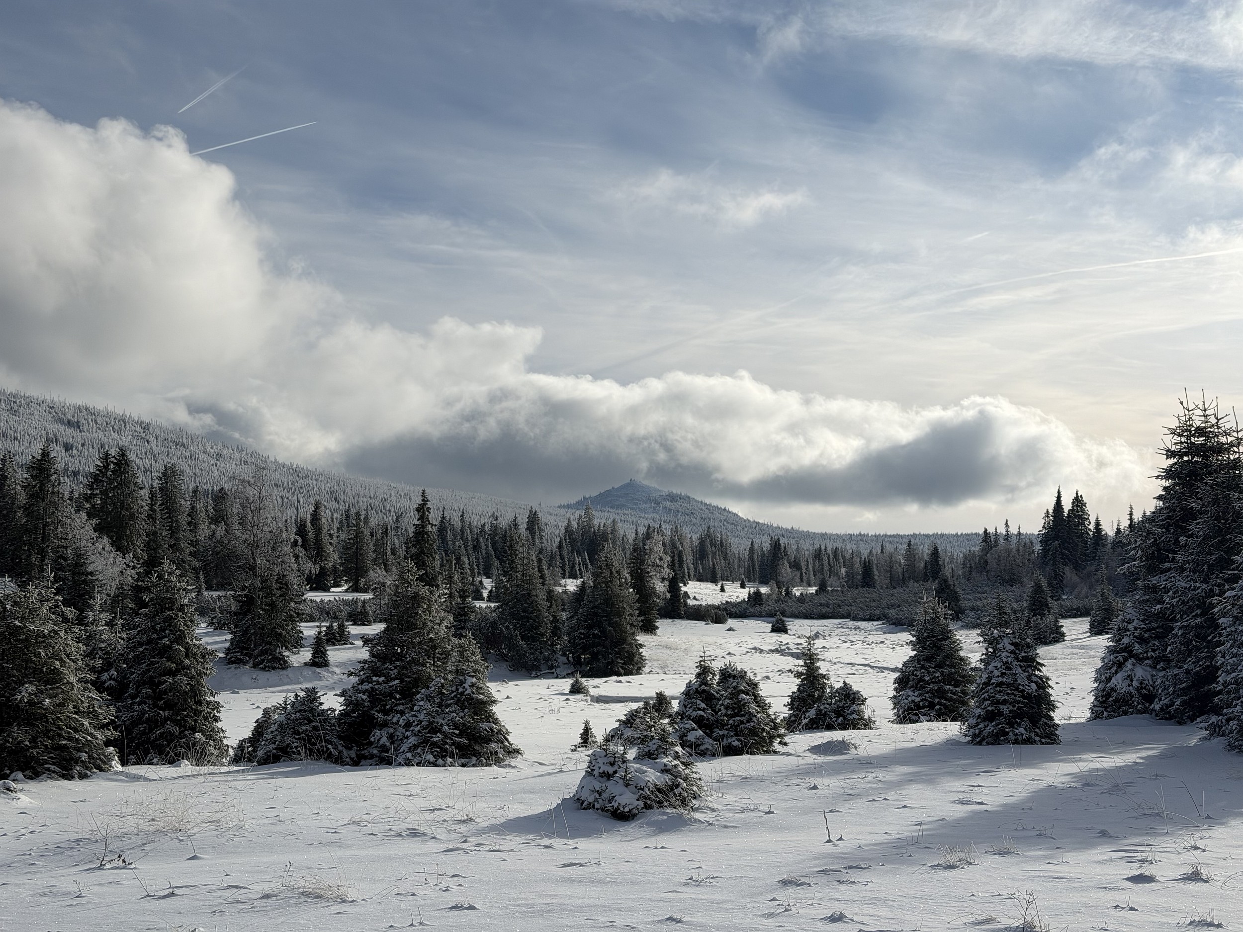 Výhled na Luzný z Březníku - na samotném vrcholu Luzného leží podobně sněhu jako na Březníku či Modravě - hřebeny Šumavy mají výrazně podprůměrné množství sněhu