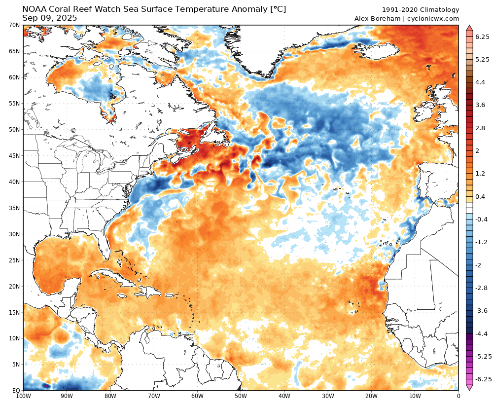 Aktuální odchylka teploty mořské vody v severním Atlantiku od dlouhodobého průměru