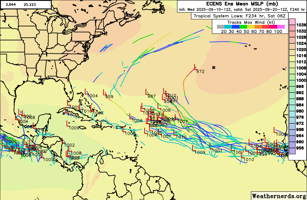 Průměr ansámblu předpovědí dráh tropických níží v Atlantiku a Karibiku podle modelu ECMWF