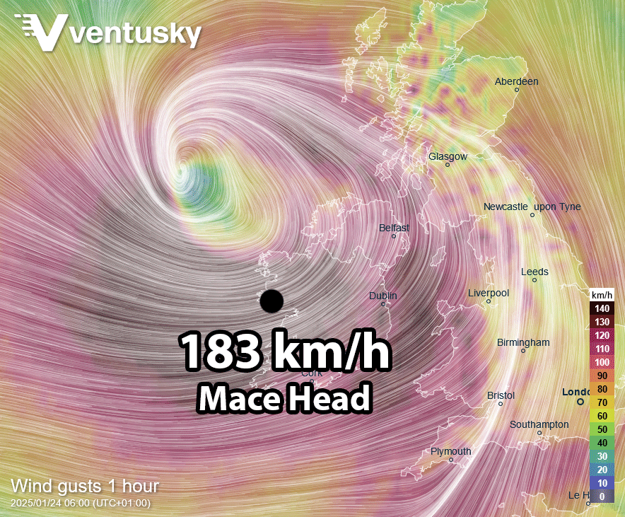 Rekordní naměřený náraz větru dnes ráno - stanice se nachází na západním pobřeží