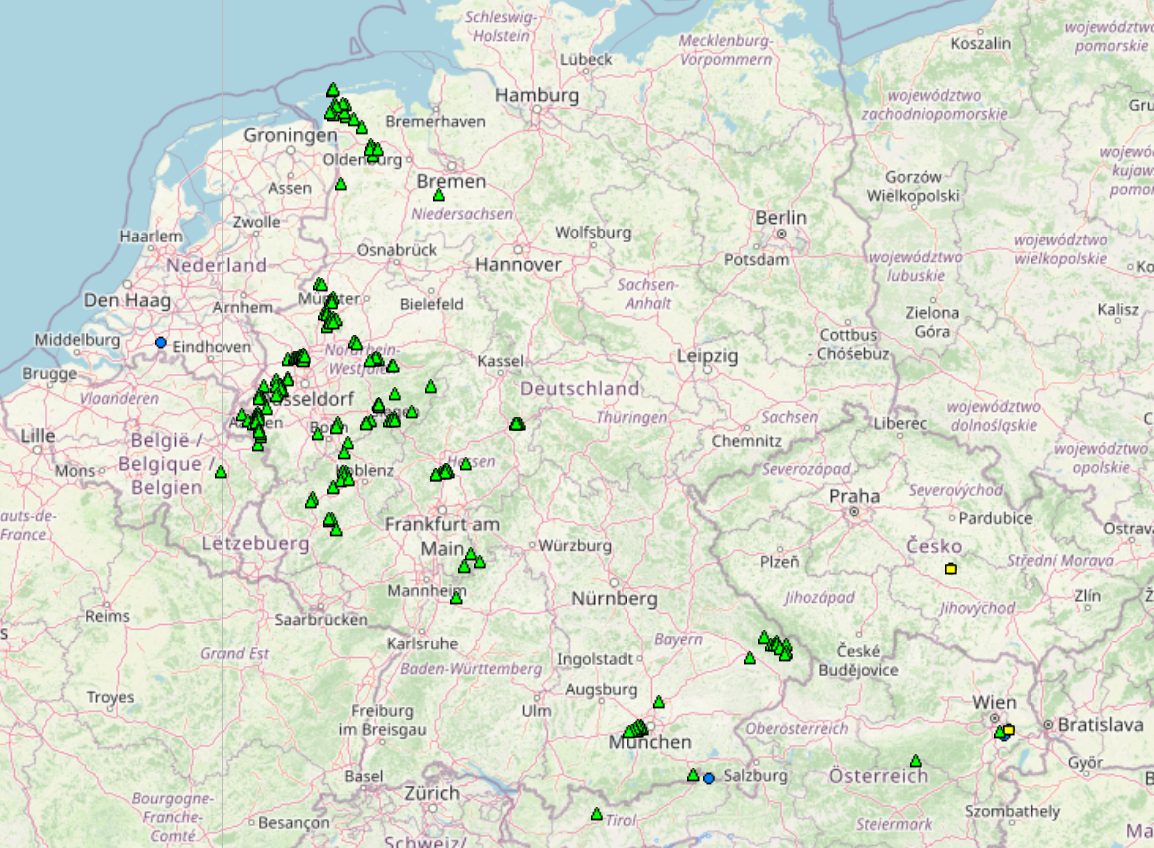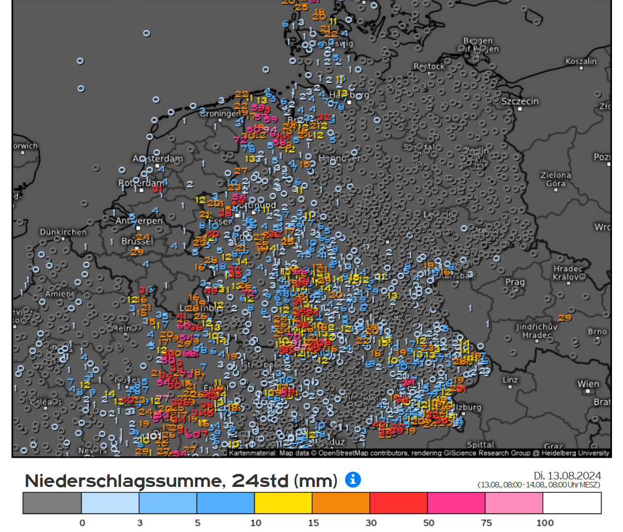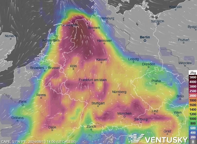 Hodnoty CAPE včera odpoledne - na západě Německa přesáhly i 3000 J/kg, dnes už se nikde takové hodnoty nečekají