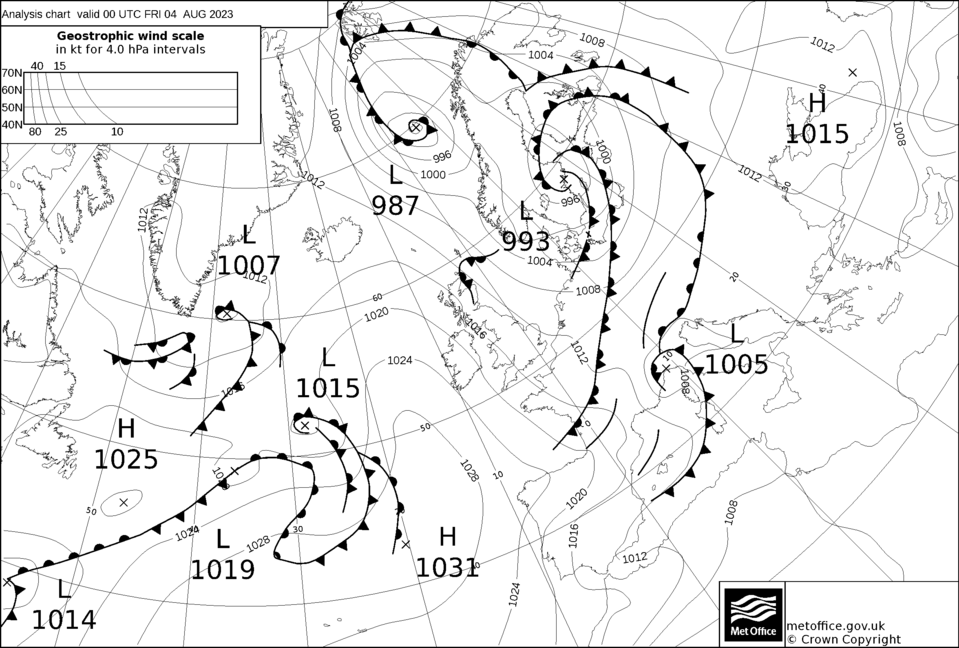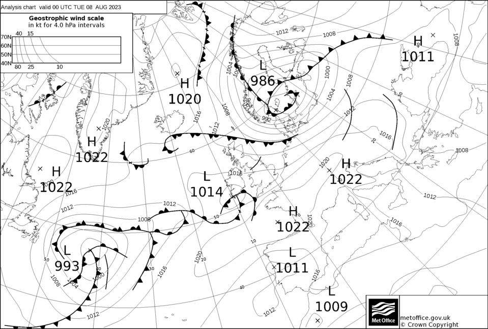 V úterý 8. srpna dosáhla tlaková níže Petar/Hans nad jižní Skandinávií svého vrcholu