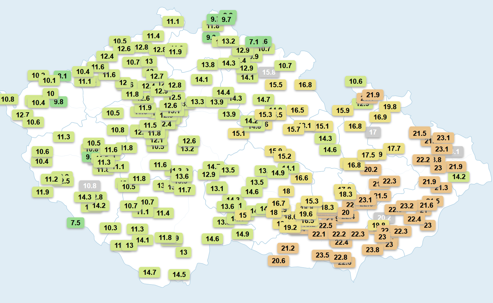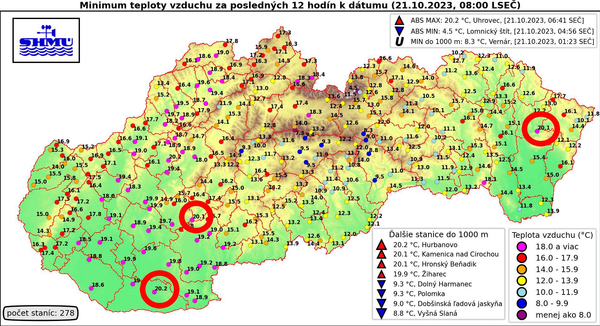 Mapa minimálních teplot na stanicích na Slovensku - vyznačeny jsou stanice, kde noční minimum nekleslo pod 20 °C