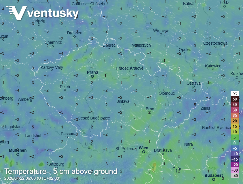 Očekávané teploty ve středu ráno v 5 cm nad zemí - mrznout bude na většině území