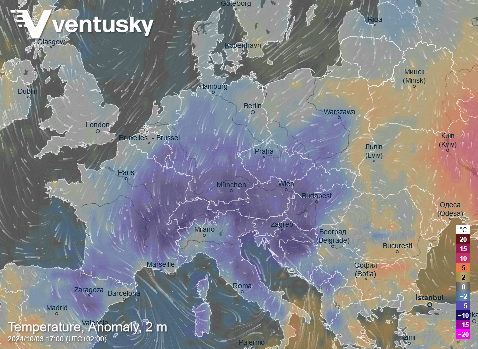 Odchylka teplot v Evropě ve čtvrtek odpoledne - kromě východu Evropy budou podprůměrné