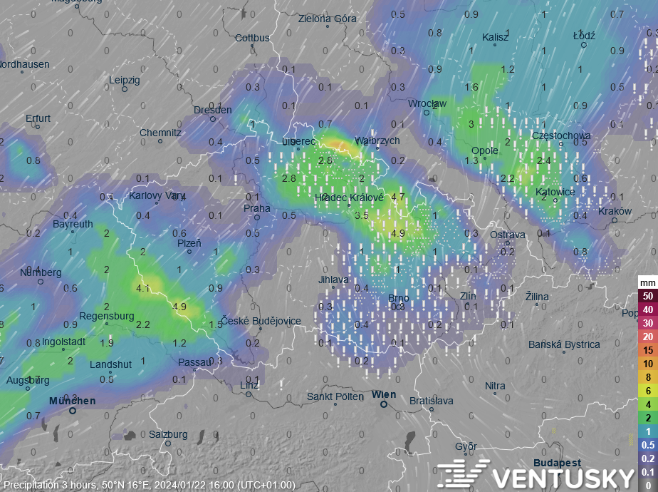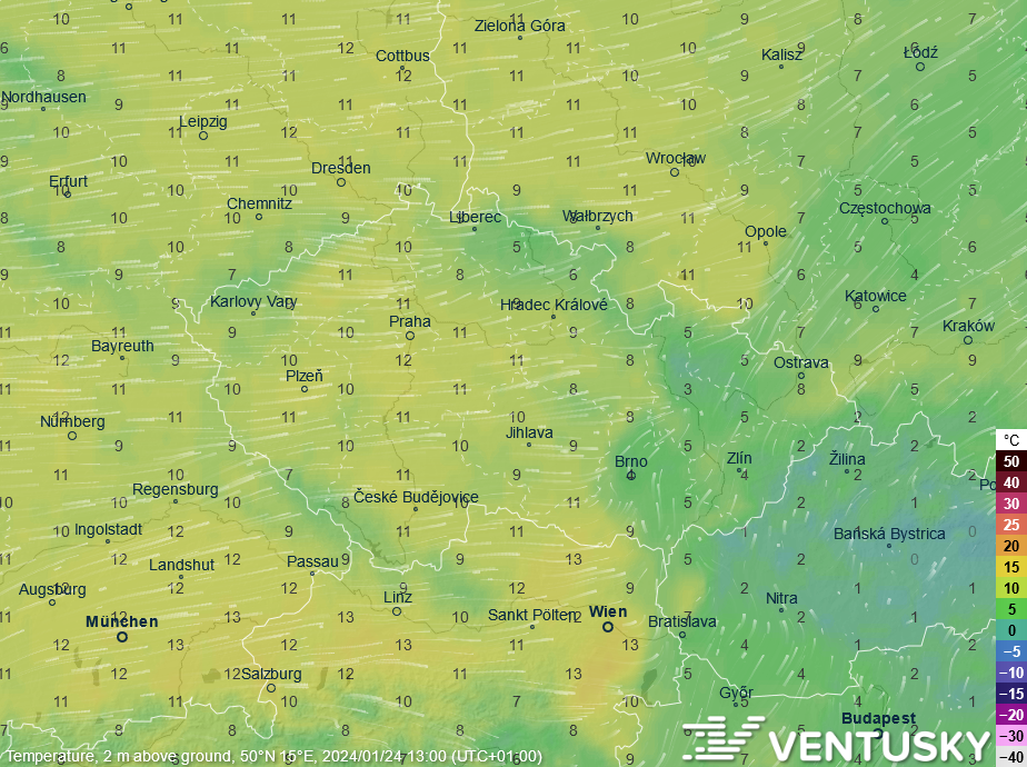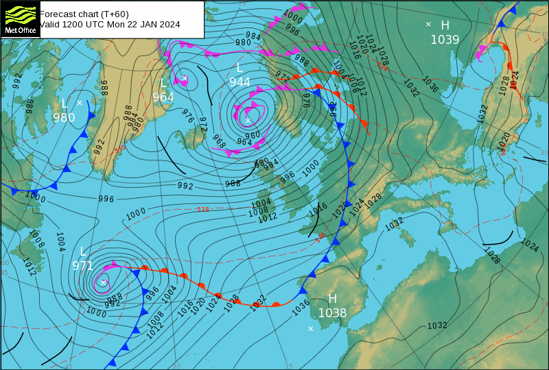 Synoptická situace v pondělí v poledne - počasí u nás začne ovlivňovat tlaková níže mezi Britskými ostrovy a Skandinávií - nejprve přejde teplá fronta a později studená