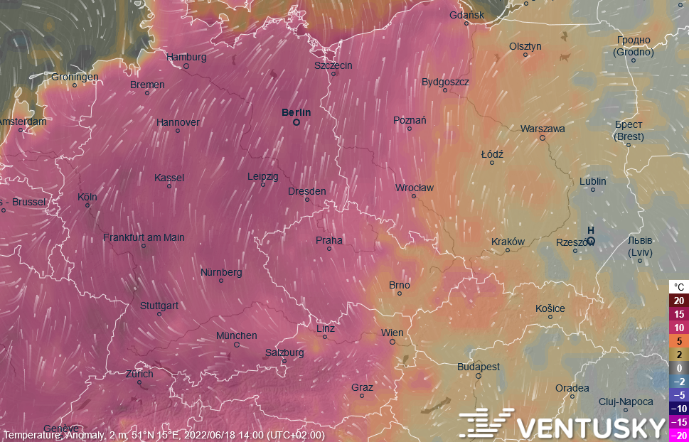 Odchylka teploty vzduchu v sobotu odpoledne vůči průměru 1981-2020 - v závěru týdne budou teploty nadprůměrné, v západní polovině střední Evropy i výrazně