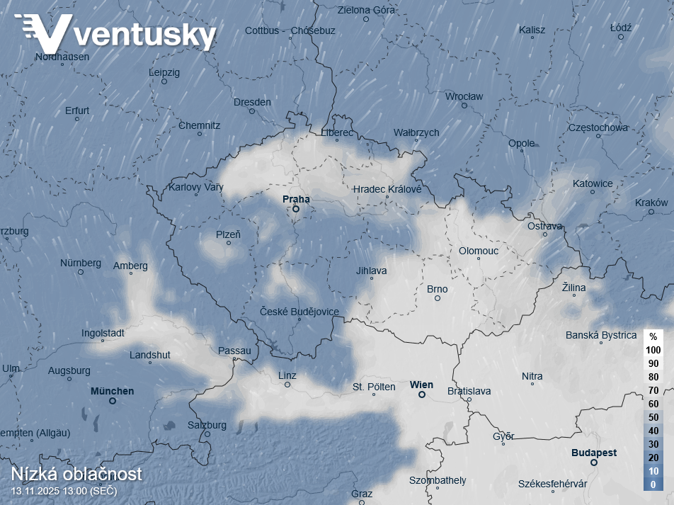 Množství nízké oblačnosti ve čtvrtek odpoledne - vyskytovat se budou hlavně na Moravě a severu Čech