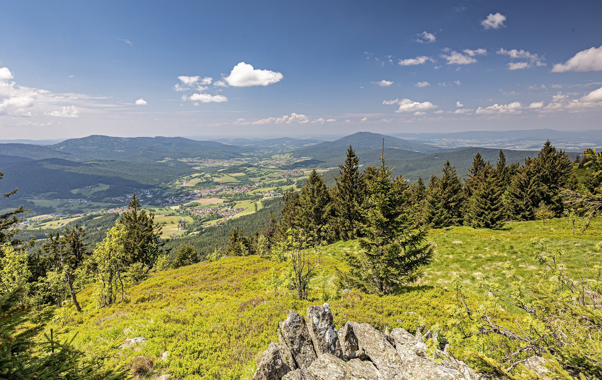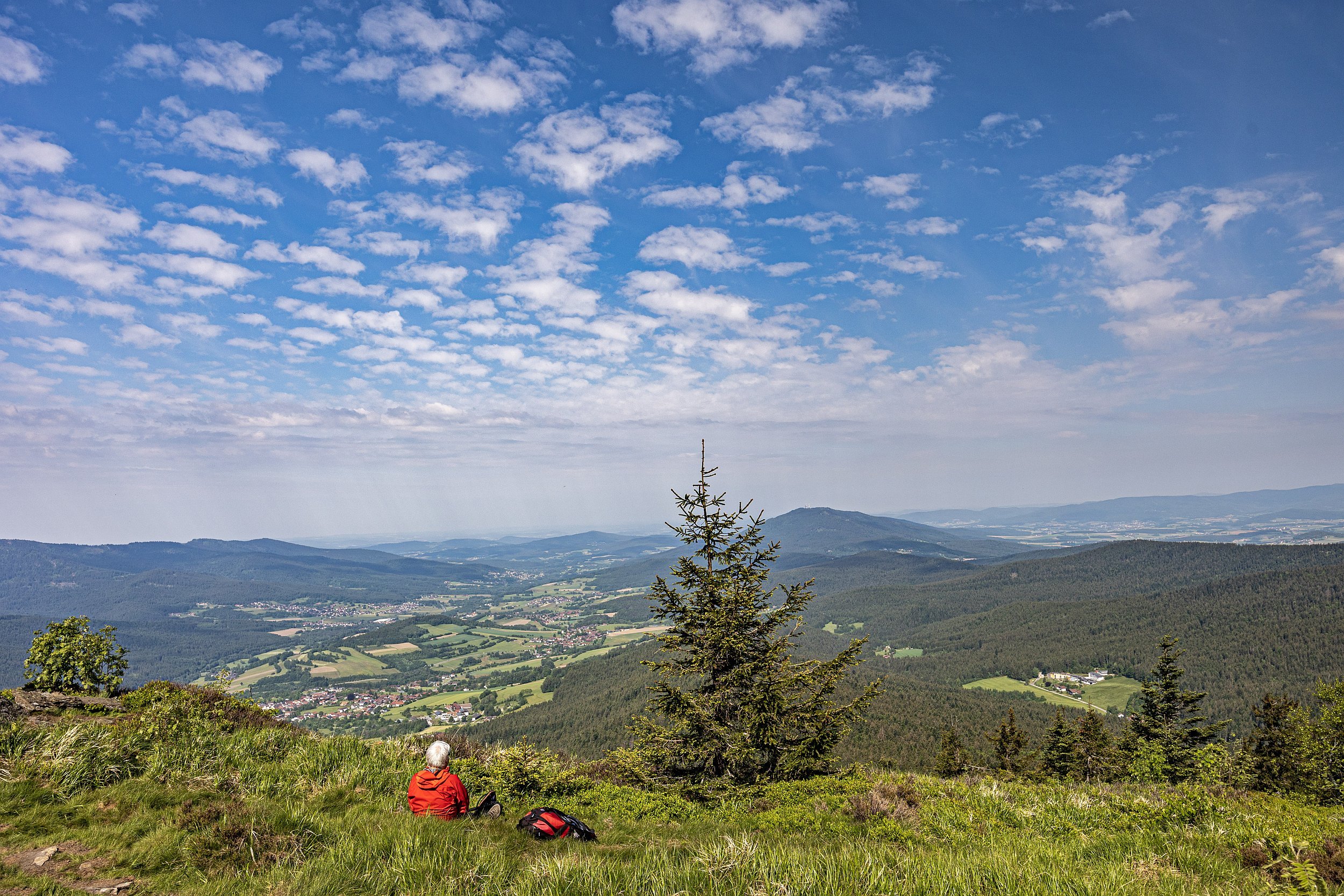 Němečtí i čeští turisté si na louce užívají výhledy do údolí, na obloze je typický oblak altocumulus