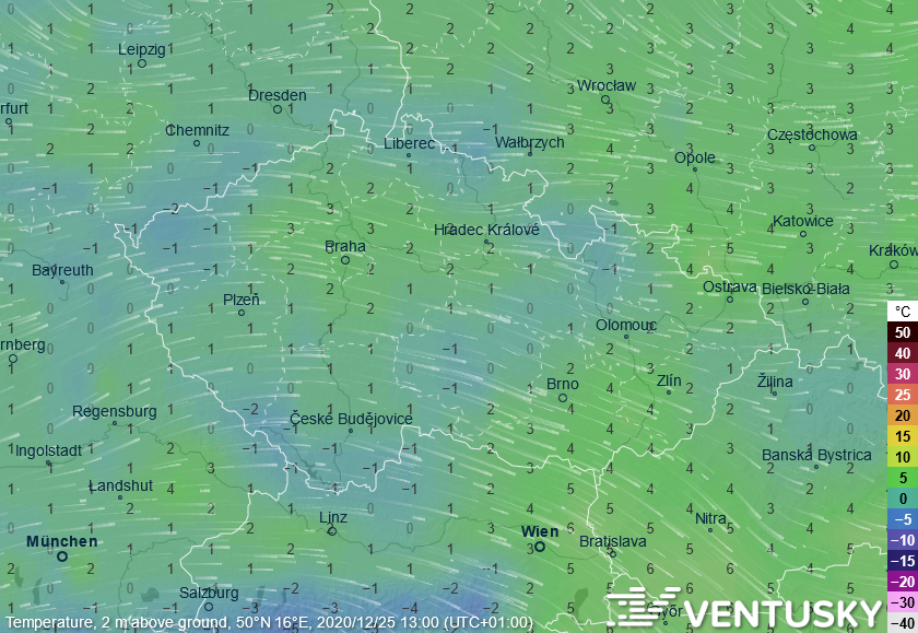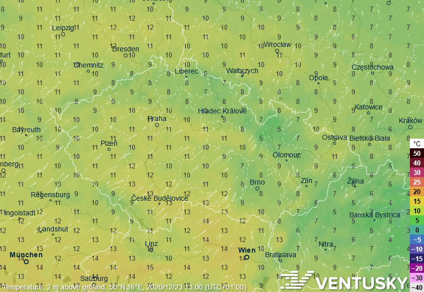 Očekávané odpolední teploty 23. prosince