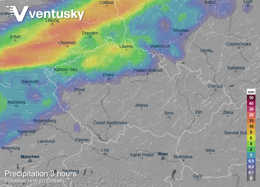 Očekávané srážky v úterý kolem poledne - od severozápadu dorazí další frontální systém