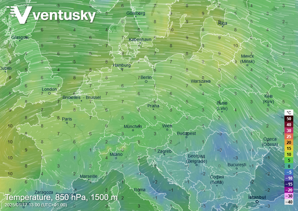 Teploty ve výšce 850 hPa (cca 1500 m nad zemí) v pátek během dne - ve výšce do Evropy začne opět proudit teplý vzduch