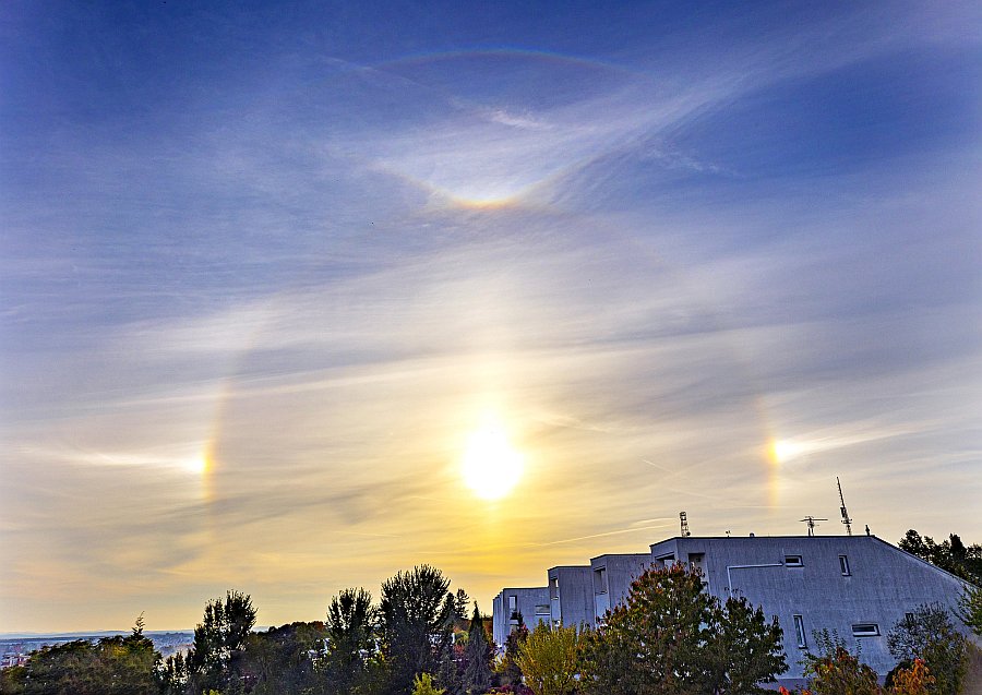 Halové jevy nad Plzní dne 18.10. - v horní části snímku je ještě patrný cirkumzenitální oblouk navazující na velmi lehce viditelný supralaterální oblouk, zdroj: Daniel Neumann