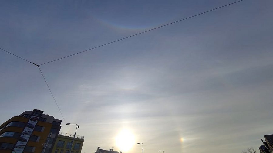 V širším záběru bylo potom nad Plzní pozorovatelný i cirkumzenitální oblouk a lehce supralaterální oblouk. Ty se vyskytují již poměrně vysoko nad Sluncem.