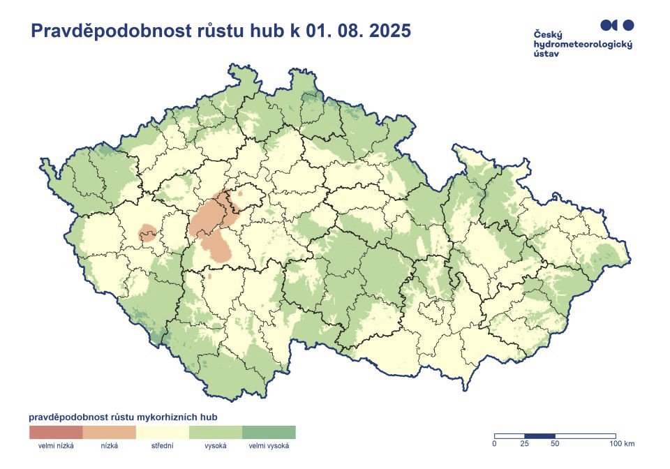 Pravděpodobnost růstu hub na našem území 1.8.2025