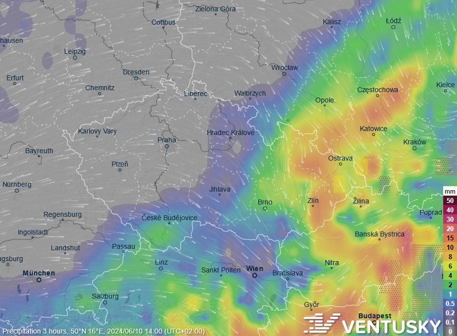 Srážky v pondělí kolem poledne (za 3 hodiny) - v jihovýchodní polovině území bude i trvale pršet