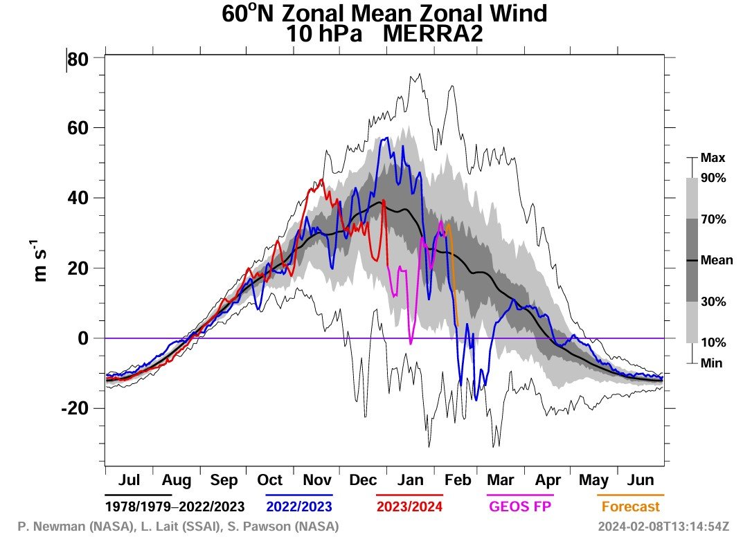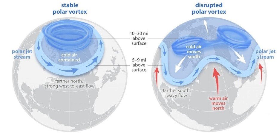 Obr. 1 Silný (vpravo) a slabý (vlevo) polární vír a jeho vliv na vpády arktického vzduchu do mírných šířek v chladné části roku