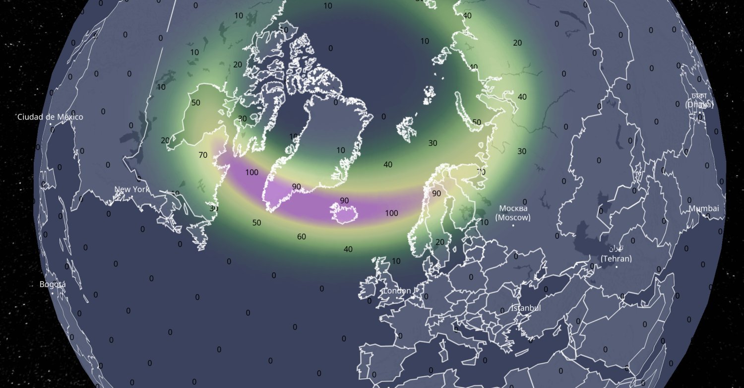 Pravděpodobnost pozorování polární záře kolem půlnoci v noci na dnešek (vyjádřená v %)