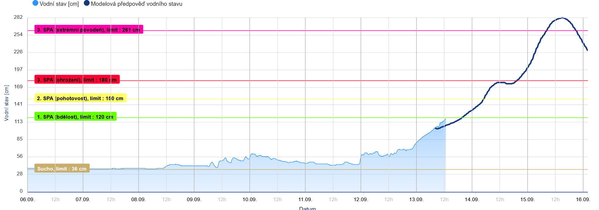 Svratka v Dalečíně aktuálně dosahuje 118 cm a brzy dosáhne na 1. SPA (120 cm) - následná modelová předpověď je jen orientační a očekává, že se hladina přiblíží 300 cm v neděli po poledni