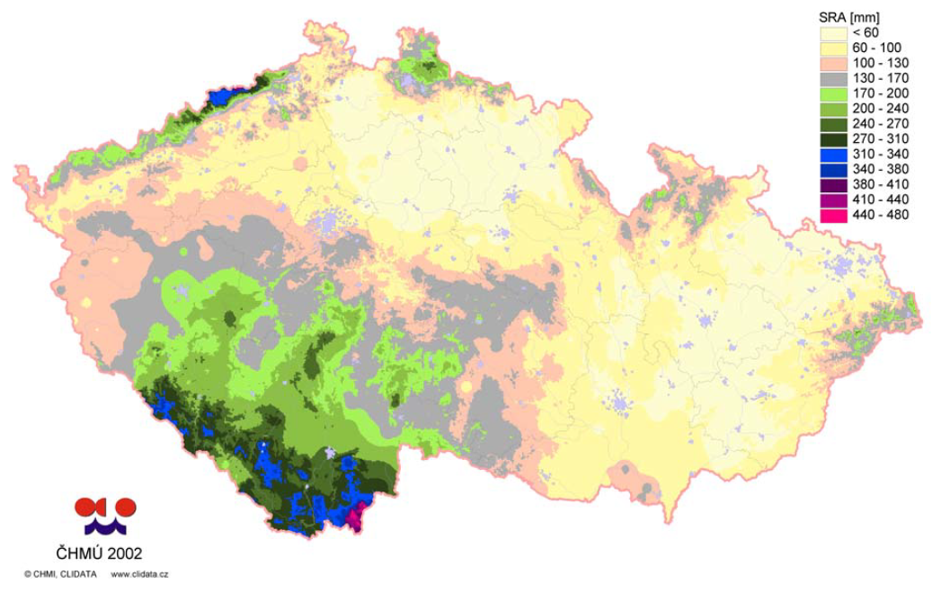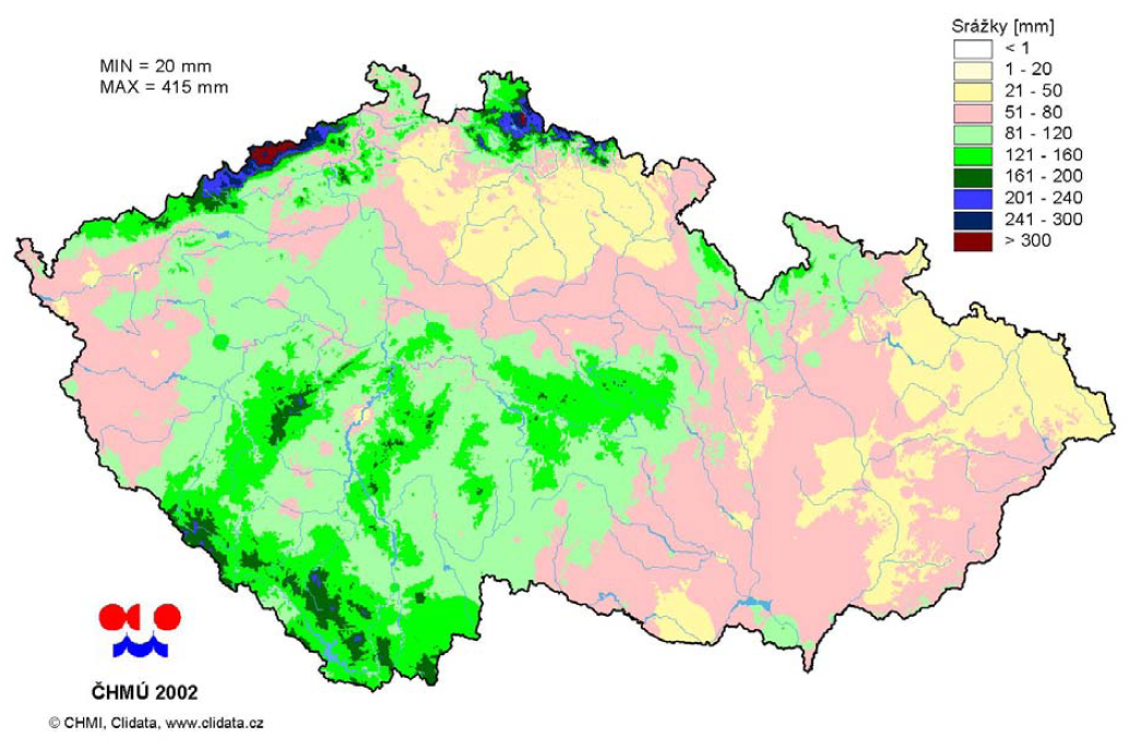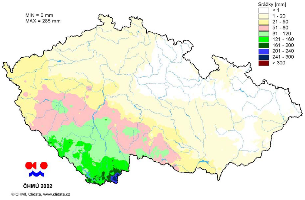 Množství vody spadlé od 11. do 13. 8. 2002